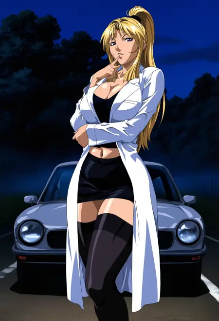 1) aged up, mature female, lab coat, grey shirt, collared shirt, purple necktie, pencil skirt, black skirt, black thighhighs
