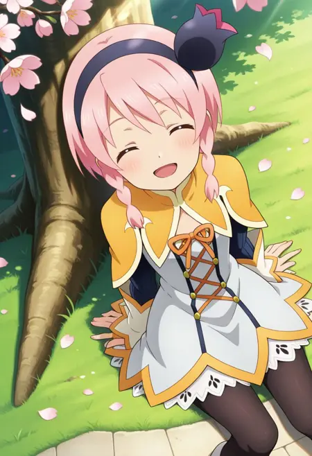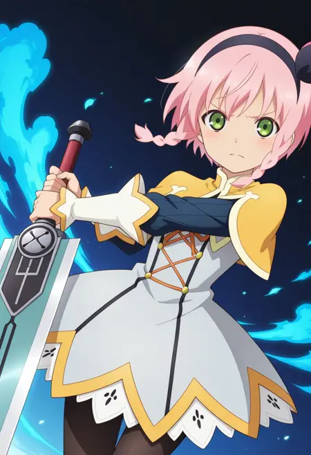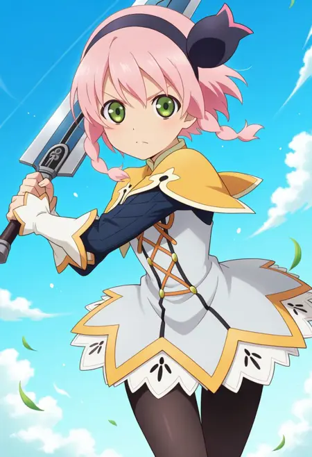 kanonnop, pink hair, short hair, side braids, headband, dress, long sleeves, white gloves, elbow gloves, capelet, laced dress, pantyhose, yellow shoes,