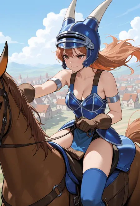 기본 복장: blue headwear, horned helmet, fake horns, blue armor, armlet, brown gloves, brown belt, blue thighhighs, bare shoulders, cleavage