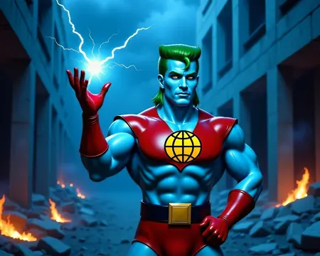 captplanet, cplant, captplant, muscular male, superhero, blue character, vibrant blue skin, blue face, handsome, perfect skin, green spiky hair, vibrant green hair, green eyebrows, vibrant green eyebrows, yellow pupils, glowing yellow eyes, white teeth, friendly smile, yellow emblem on chest, round chest emblem, red cropped top, red top with v-neck, short red shorts, red gloves, red hands, red fingers, black belt, yellow rectangle belt buckle, red boots, heroic, confident pose, joyful expression, natural lighting, medium close-up, elemental powers, glowing energy, environmental superhero, powerful aura