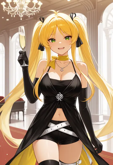 パワフルな記念日!: h0rnetdress, 長い髪, 金髪, 横髪, アホ毛, ツインテール, 髪リボン, 黒いリボン, 緑の目, 黒いドレス, 黒い手袋, 肘まで手袋, 黒いショートパンツ, 短いショートパンツ, 複数のベルト, 白いベルト, 黒いタイツ, 太ももベルト, 白い靴, ハイヒール, 黄色いスカーフ, ネックレス, 肩を露出, 鎖骨, 腹部, 胸元, 大きな胸