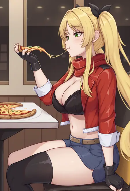 焼き立てのきずな!: h0rnetjkt, 長い髪, 金髪, 横髪, ツインテール, 髪リボン, 黒いリボン, 緑の目, ファーのトリム, 赤いジャケット, 短めのジャケット, 開いたジャケット, 袖が肘より長い, 黒いブラ, 黒い手袋, 指なし手袋, 青いショートパンツ, デニムショートパンツ, 短いショートパンツ, 茶色のベルト, 黒いタイツ, 単一のタイツ, 赤いスカーフ, 腹部, へそ, 胸元, 大きな胸