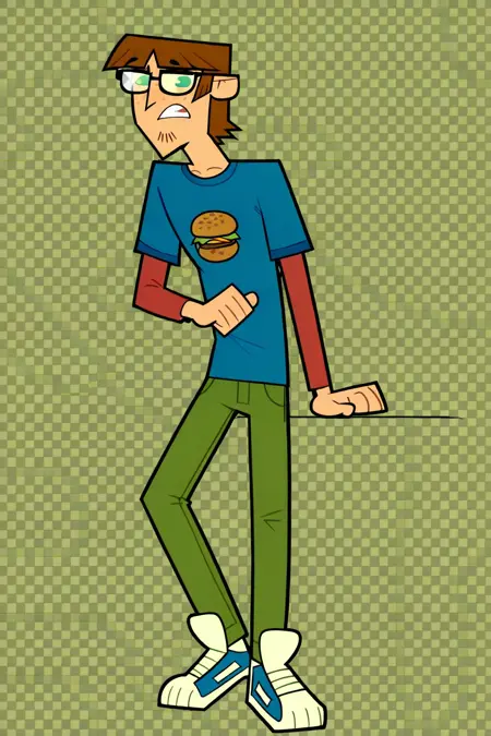 HaroldTDI, 1boy, shaggy brown hair, black glasses, visible freckles, small brown goatee, blue shirt with a hamburger symbol, red long sleeves, olive green pants, white sneakers with blue accents, green eyes, Harold (tdi),