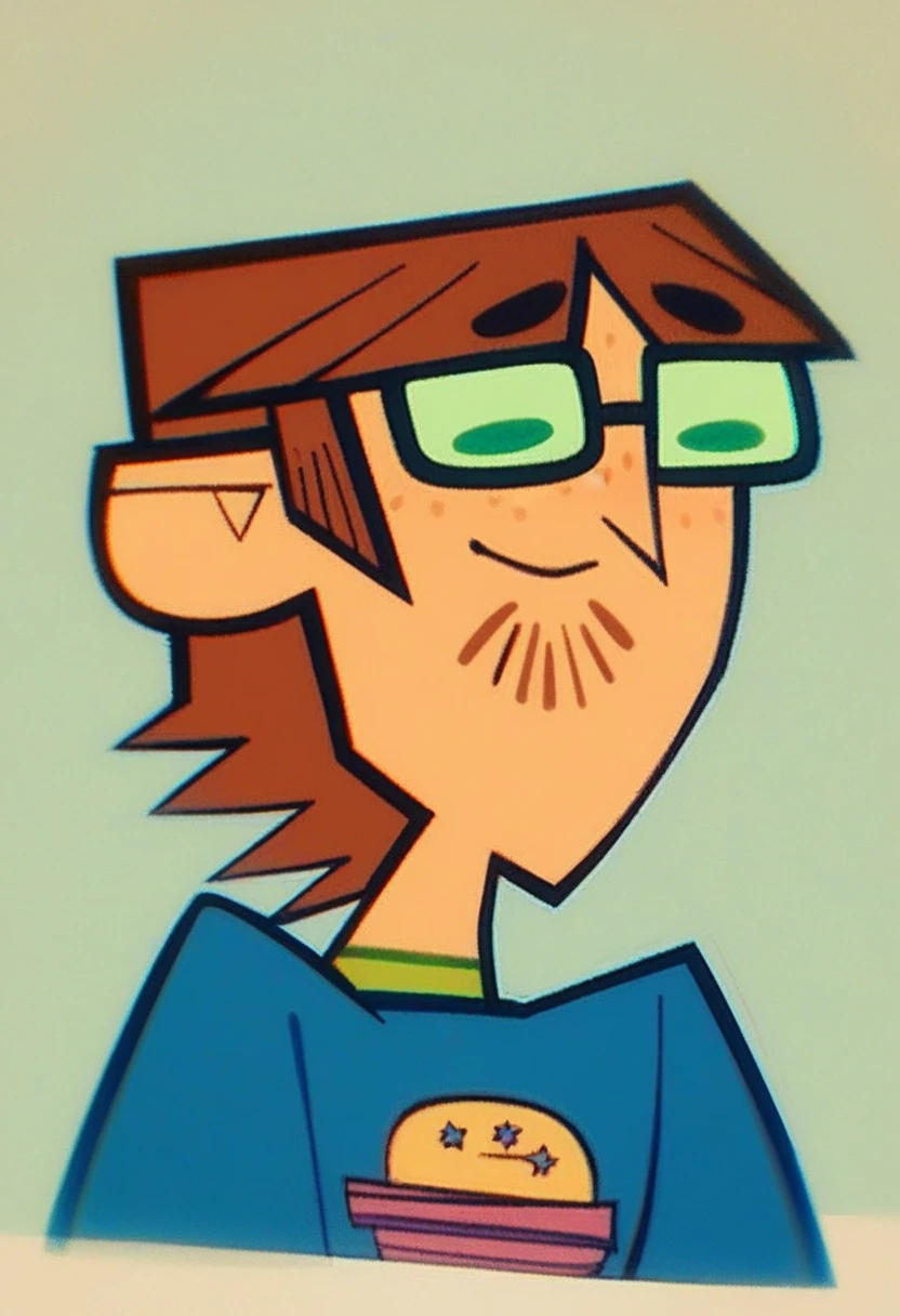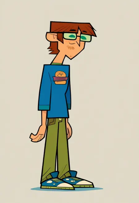 HaroldTDI, 1boy, shaggy brown hair, black glasses, visible freckles, small brown goatee, blue shirt with a hamburger symbol, red long sleeves, olive green pants, white sneakers with blue accents, green eyes,