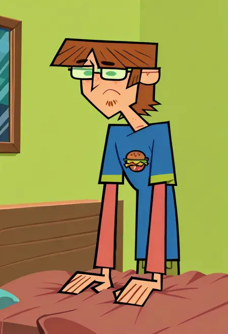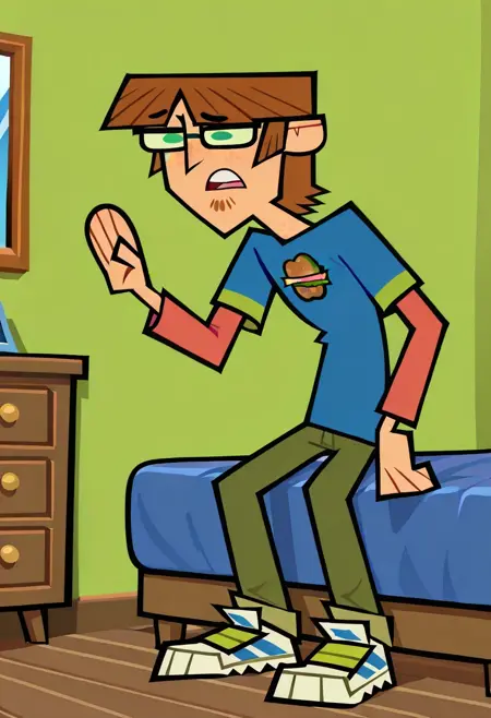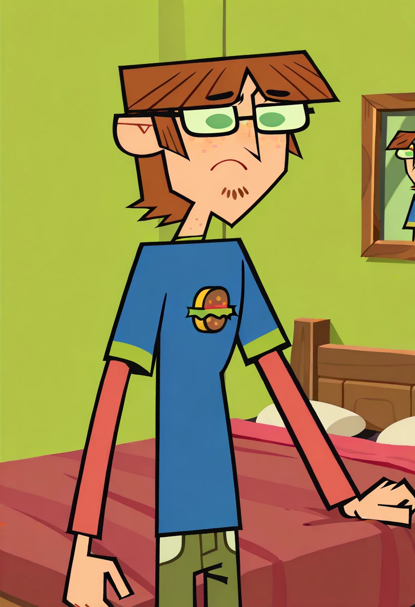 HaroldTDI, 1boy, shaggy brown hair, black glasses, visible freckles, small brown goatee, blue shirt with a hamburger symbol, red long sleeves, olive green pants, white sneakers with blue accents, green eyes