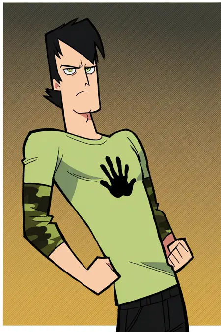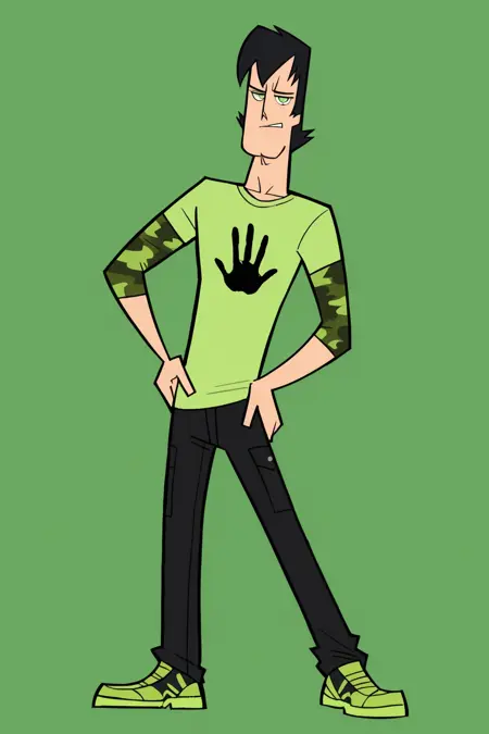 TrentTDI, 1boy, black hair, green shirt featuring a black handprint symbol, camo-patterned sleeves, black pants, lime green eyes, trent (tdi),