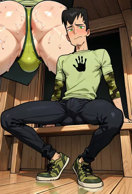 TrentTDI, 1boy, black hair, green shirt featuring a black handprint symbol, camo-patterned sleeves, black pants, lime green eyes,