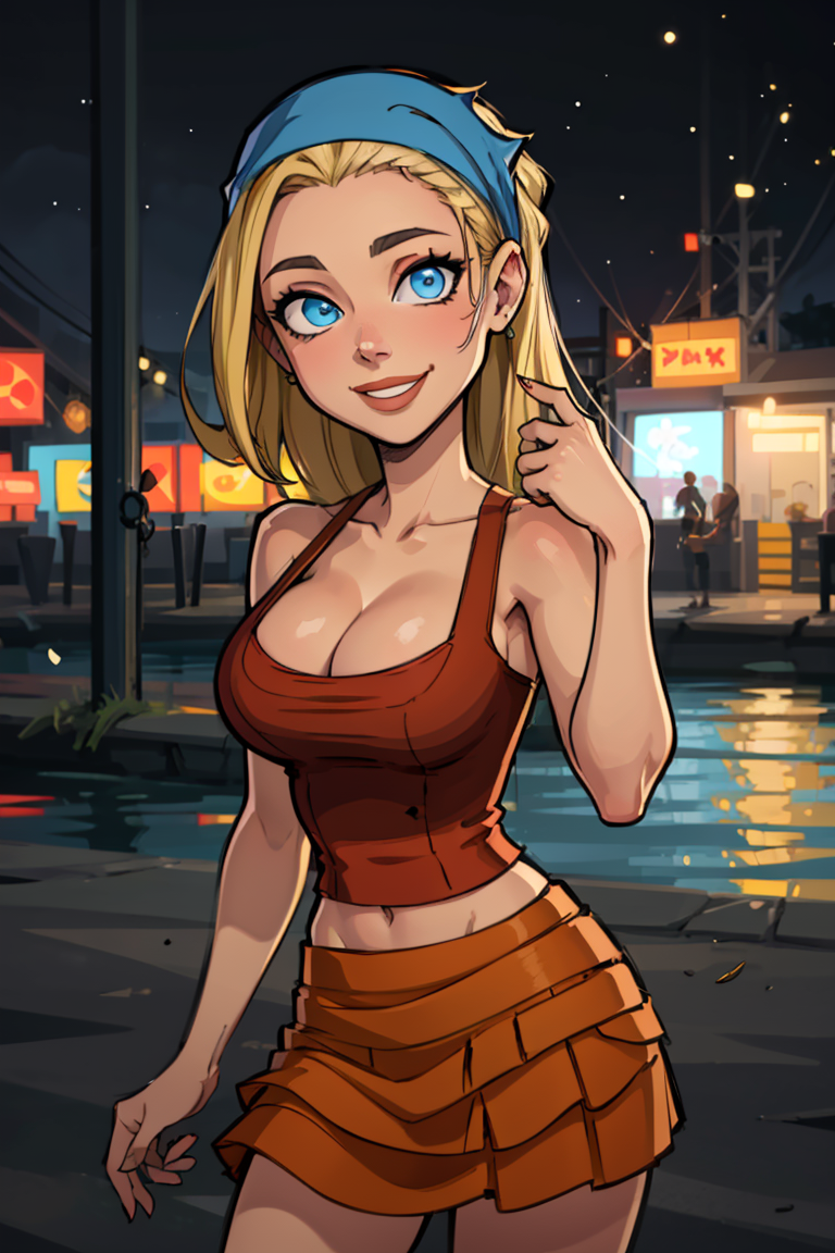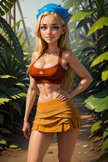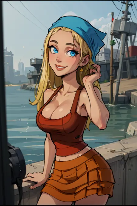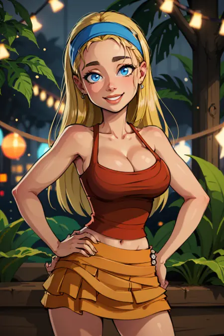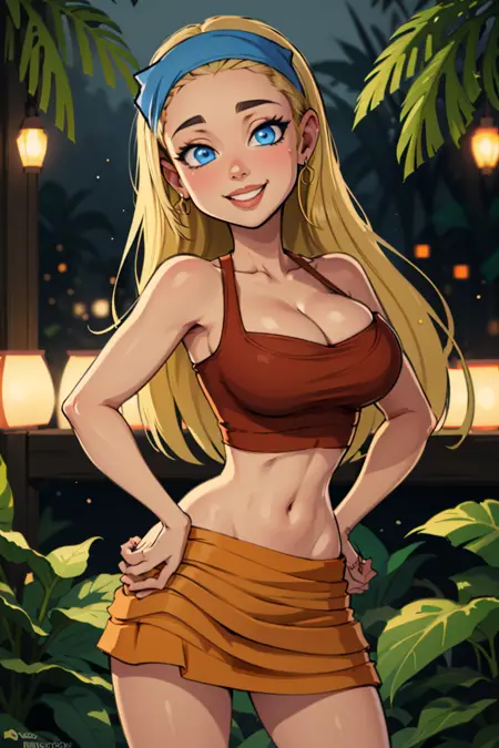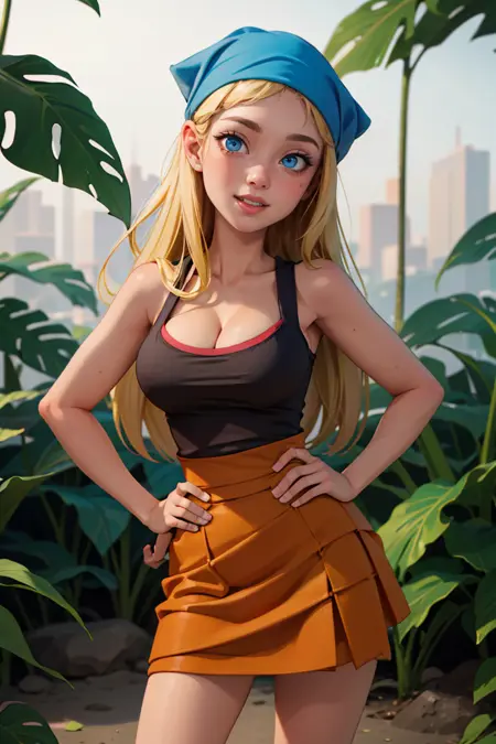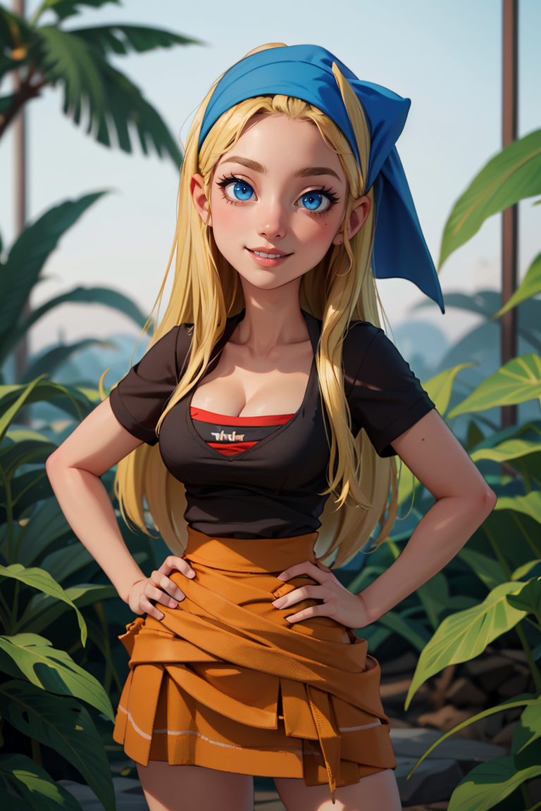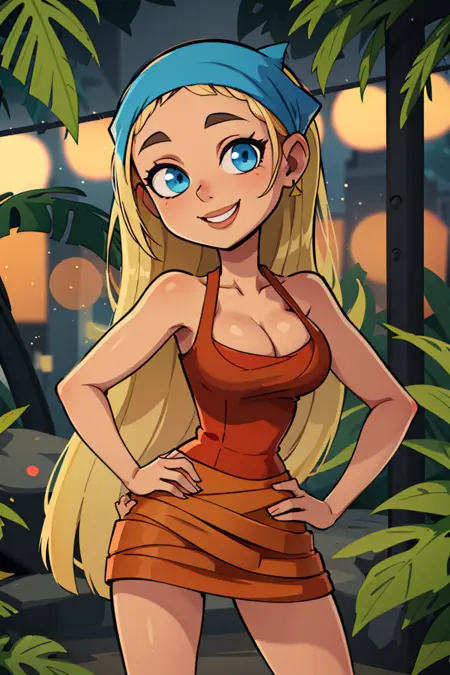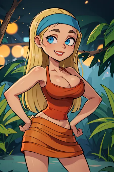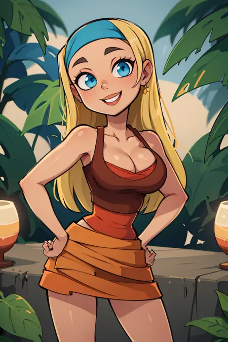 Lindsay_Total_Drama, 1girl, solo, blue eyes, long hair, blonde hair, large breasts, cleavage, bandana, skirt