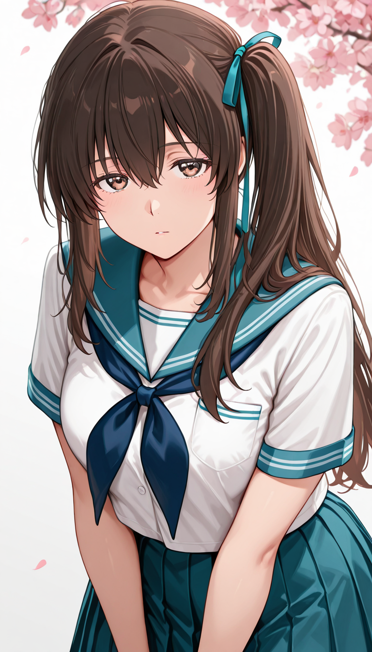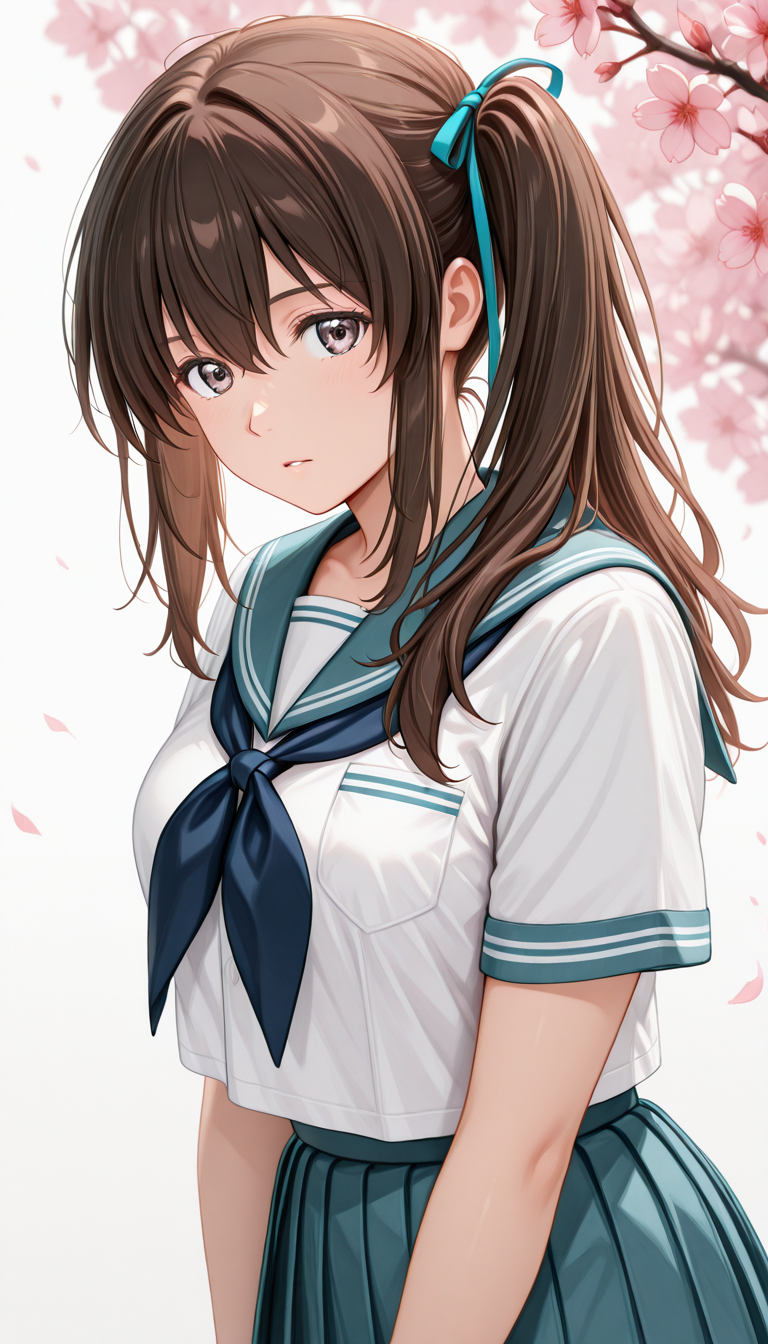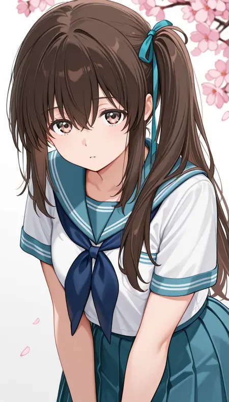 uniform: (serafuku), white blouse, ((light blue pleated skirt:1.3)), dark blue neckerchief, white ankle socks, brown loafers, Light blue short sleeves, dark blue line