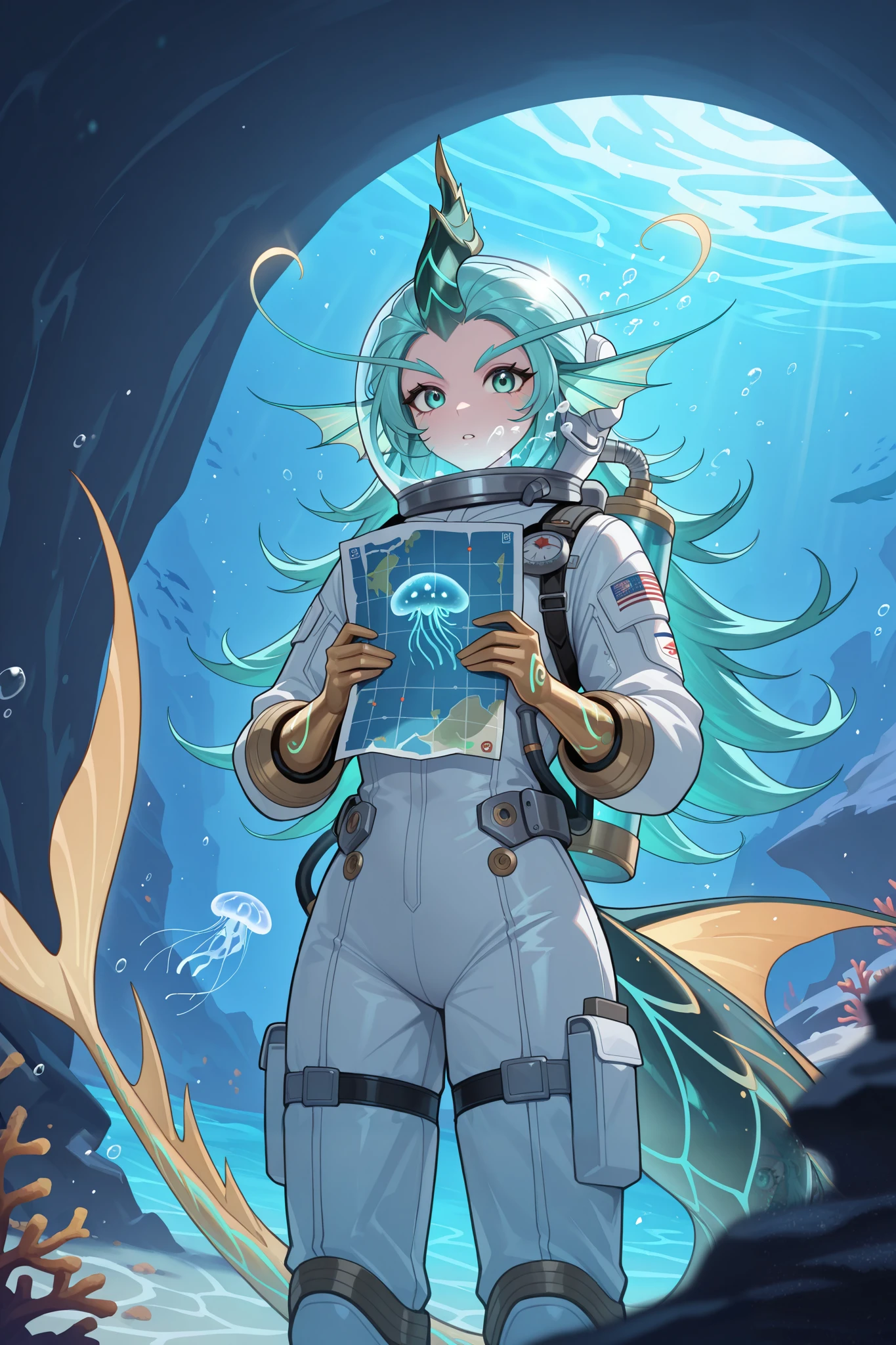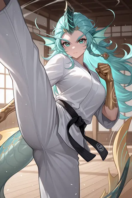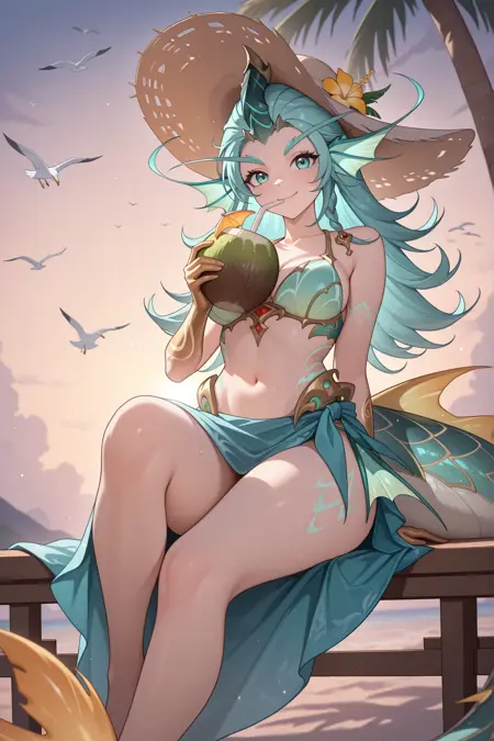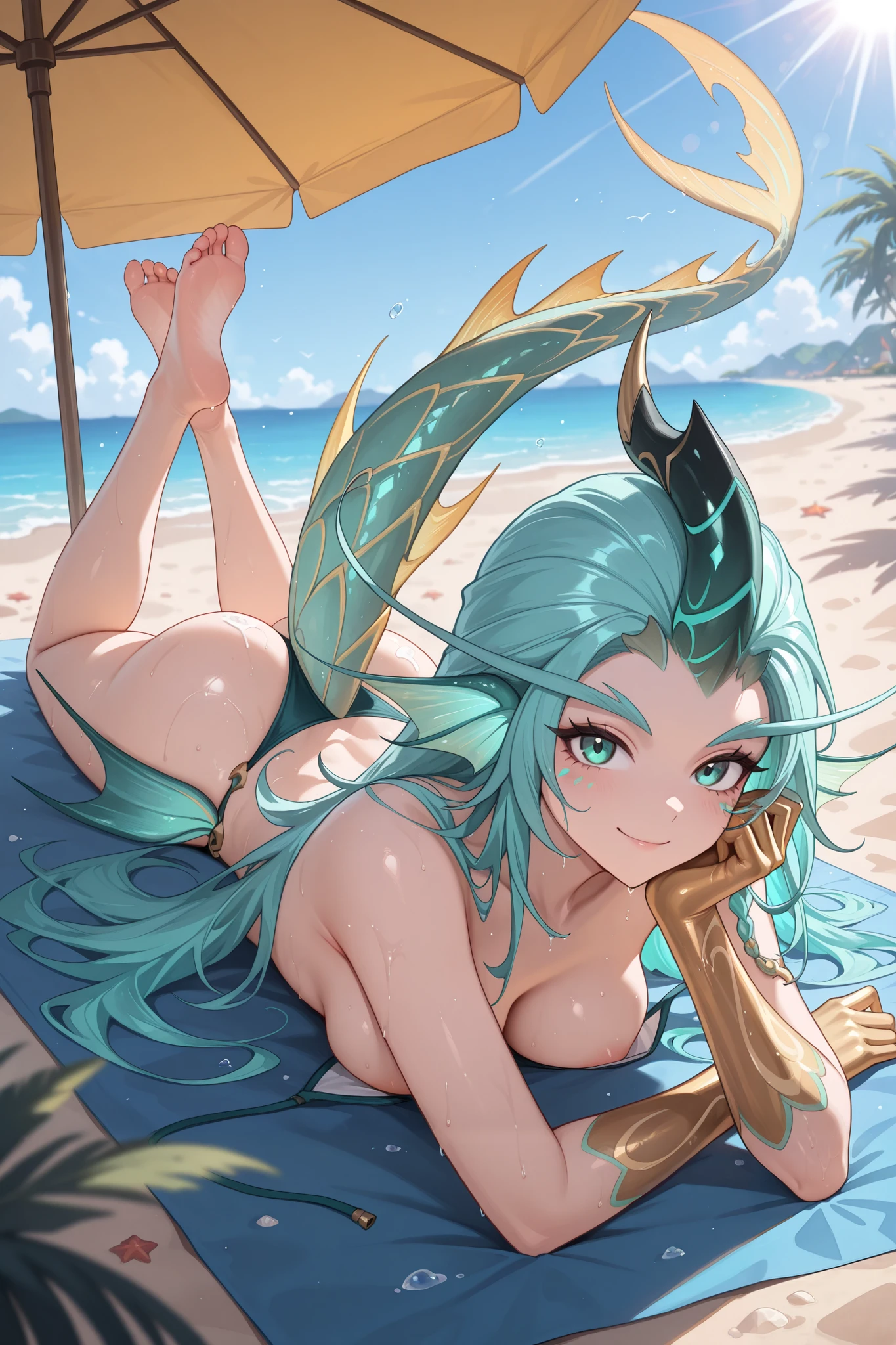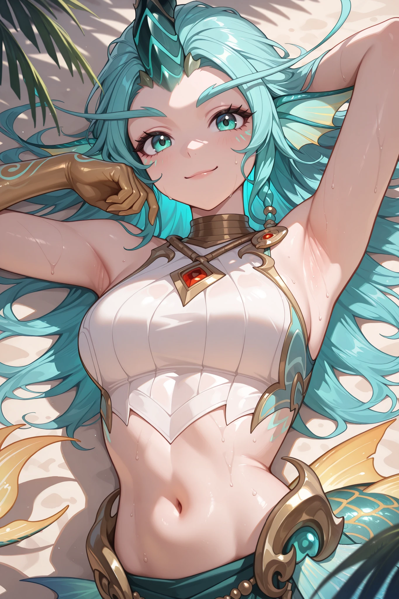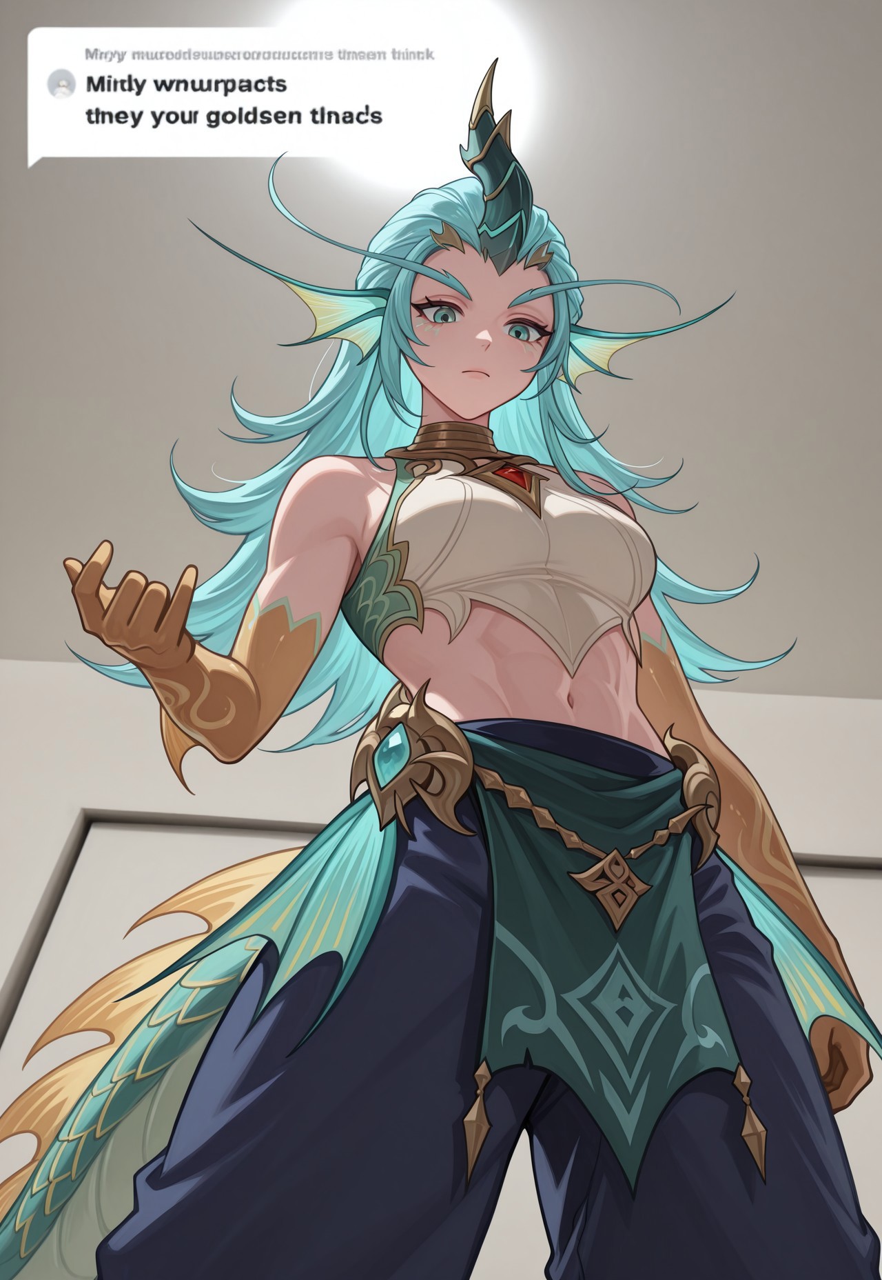 1girl, kaleamlbb, long hair, aqua hair, aqua eyes, single horn, head fins, long eyebrows, golden hand skins, waist fins, dark green scaly tail, sleeveless top, jewelry, midriff, loincloth, blue baggy pants, anklet, barefoot