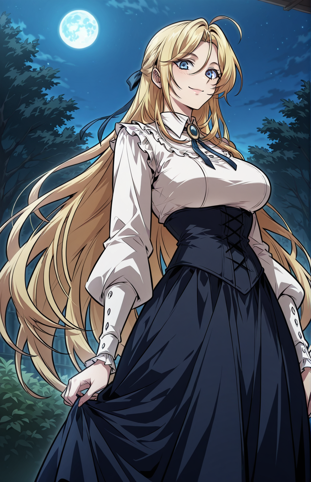 Froidmain_outfit2,白色衬衫,荷叶边衬衫,荷叶边装饰,荷叶边肩部,有领衬衫,长袖,纽扣袖口,深蓝色丝带领结,蓝色宝石胸针,深蓝色束腰,长裙,蓬裙,深蓝色裙子,荷叶边裙摆,