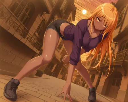 agna, dark-skinned female, abs, very long hair, orange eyes, blonde hair, muscular, abs, tattoo,