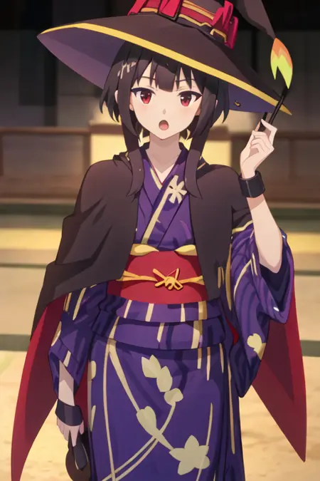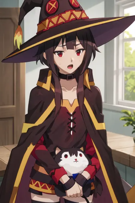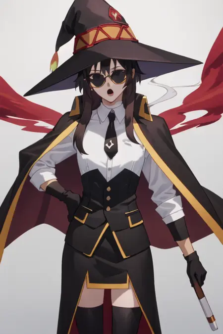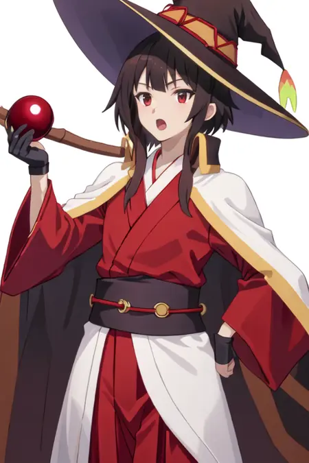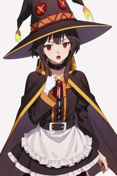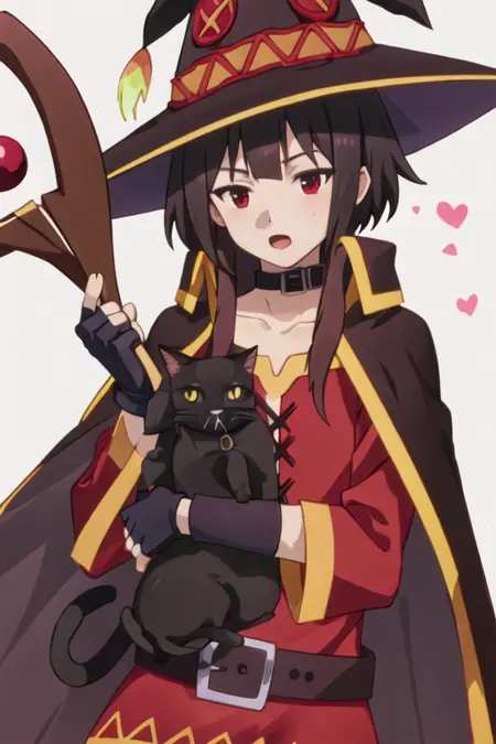 トリガーワードはmegumin_konosubaで、推奨タグはbest quality, masterpiece, highres, solo, {megumin_konosuba:1.15}, short_hair, brown_hair, red_eyes, short_hair_with_long_locks, hat, witch_hat, cape, black_hair, open_mouthです。
