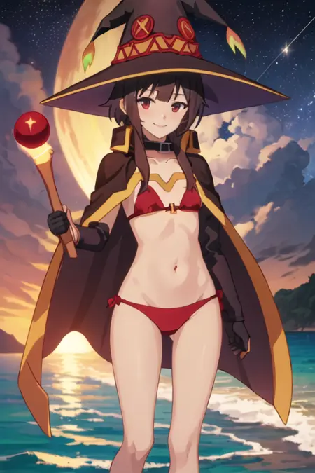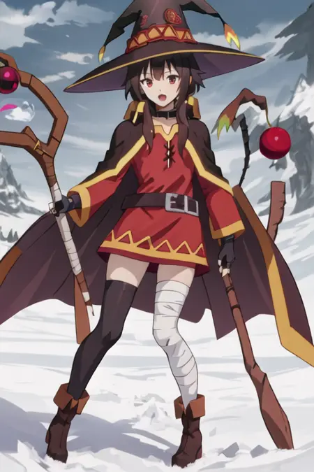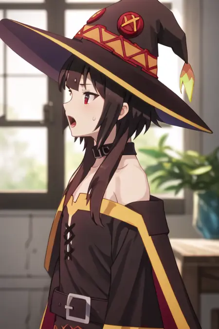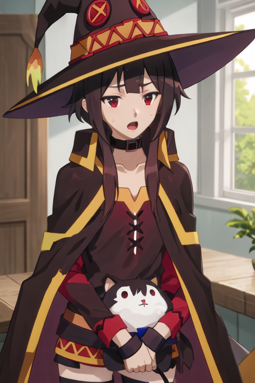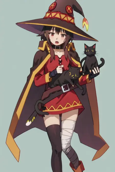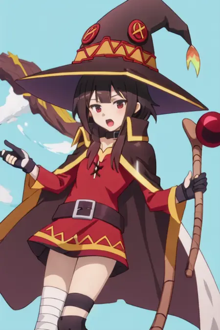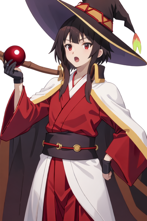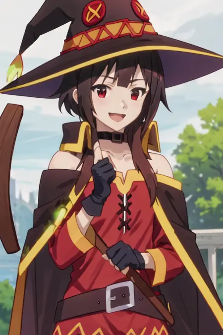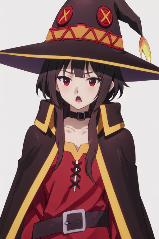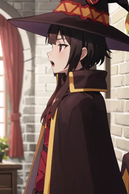 触发词为 megumin_konosuba,推荐标签为:best quality, masterpiece, highres, solo, {megumin_konosuba:1.15}, short_hair, brown_hair, red_eyes, short_hair_with_long_locks, hat, witch_hat, cape, black_hair, open_mouth。