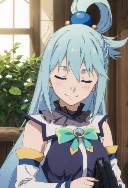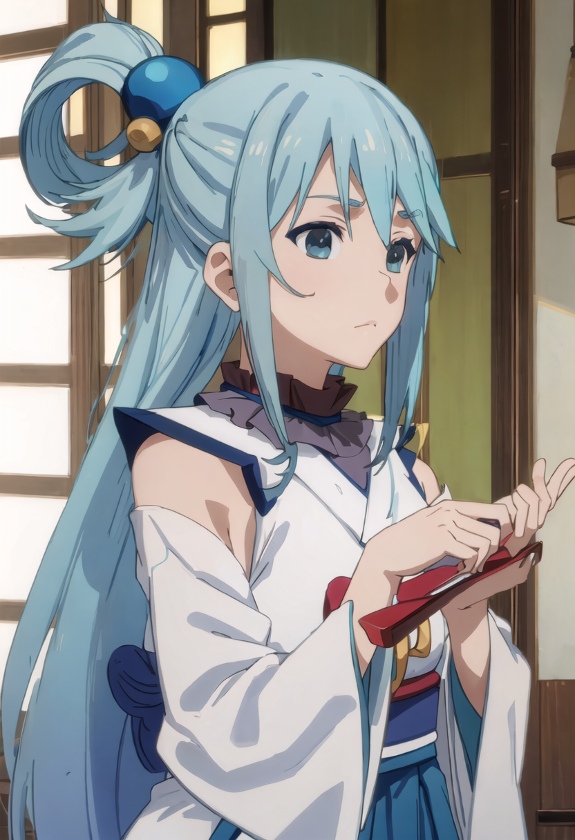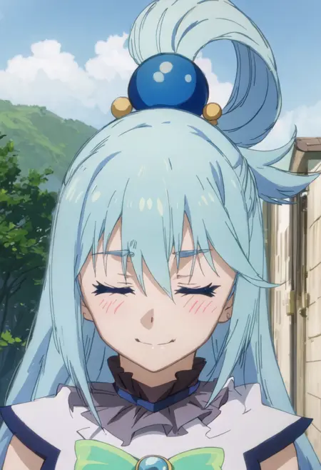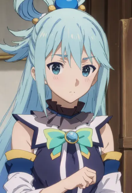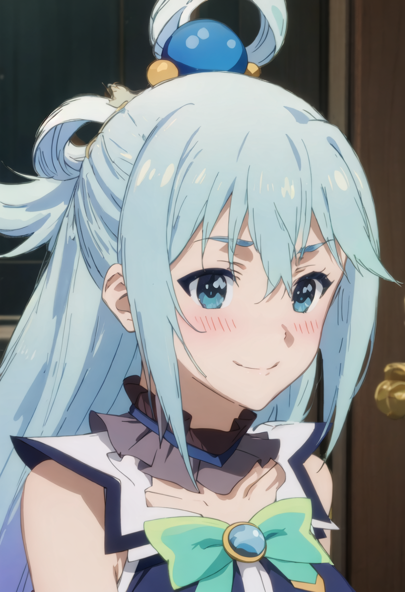 トリガー語は aqua_konosuba であり、削減されたタグは blue_hair, long_hair, hair_ornament, hair_rings, blue_eyes, bow, green_bow です。あるとき、一部の特徴(例:髪の色)が安定しない場合、これらのタグをプロンプトに追加してください。