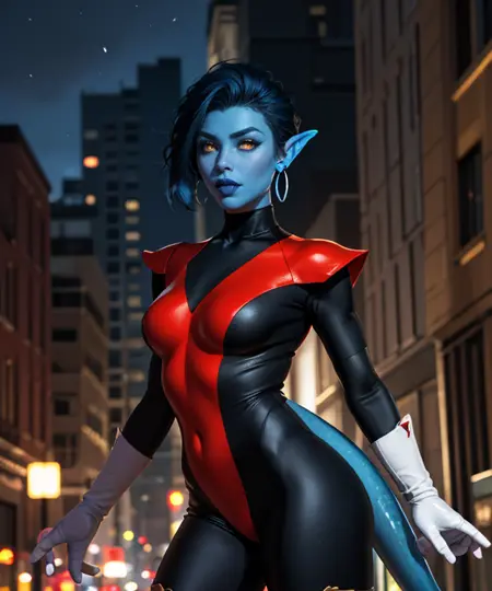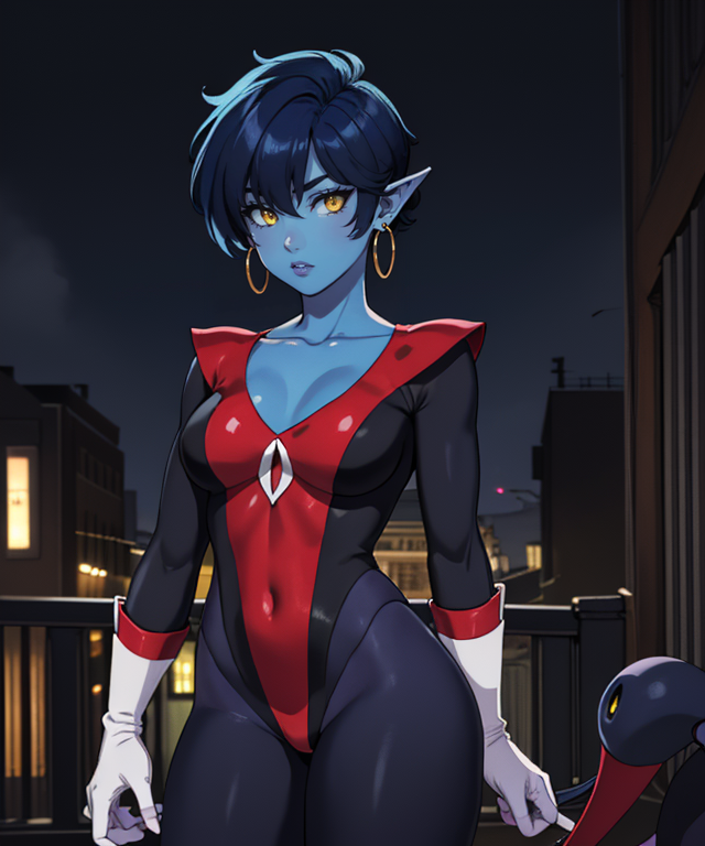 외모 프롬프트 힌트: colored_skin, blue_skin, blank_yellow_eyes, blue_ears, pointed_ears, pointy_ears, blue_devil_tail, blue_lips, evil_grin, fangs,