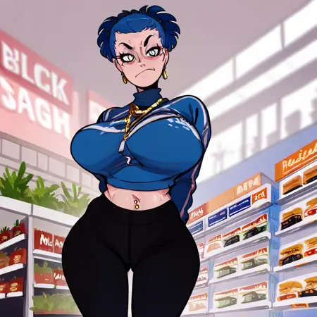 ((lora:ceci's\_mom:1 , ceci's_mom, cecimom, beautiful blue hair, beautiful haircut, hair scrunchie, clear eyes, piercing blue eyes, bright pupils, beautiful eyes, huge and shaggy breast, thin waist, wide hips, beautiful skin, beauty, extraordinary beautiful girl, milf, attractive woman, super sexy woman, lustful body, sexy woman with seductive obscene body, sensual body, voluptuous body, sexy milf, )) , 1mole under right eye, cesarean section scar