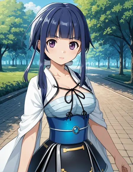 魔法服装: mgrcasukatatsuki, asukamgc, 开放式白袍,白色发带,黑色丝带,蓝色肩带,胸部束胸布,蓝色腰带,白色腰绳,蓝色宝石,黑色护甲裙,白色荷叶边,蓝色过膝袜,黑色木屐