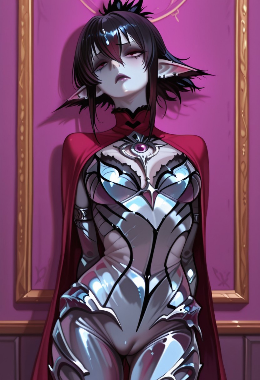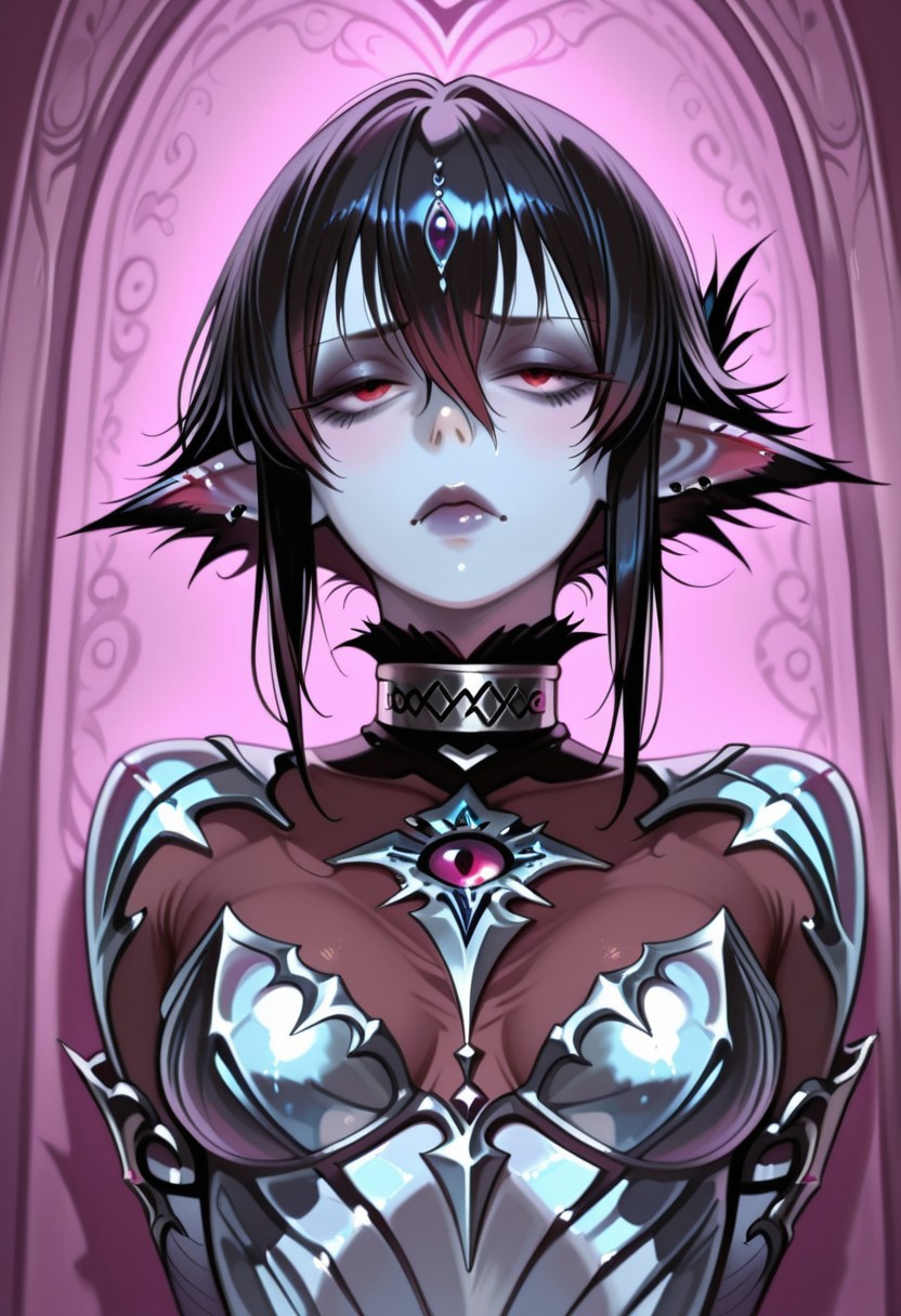demon girl, pointy ears, ancient night eyes, raven hair, black hair, silver chains, dark crystals, shadow collar, high full breasts, scarred, slender, regal, fertile, cameltoe, former princess, collar of twisted shadow metal, elongated ears, irresistible allure, erotic subservience, living embodiment of desire, haunting gaze, sinuous grace, tapestry of despair, in shadow, perpetual readiness, silent dignity, moonlit heritage, dark magic conduit.
