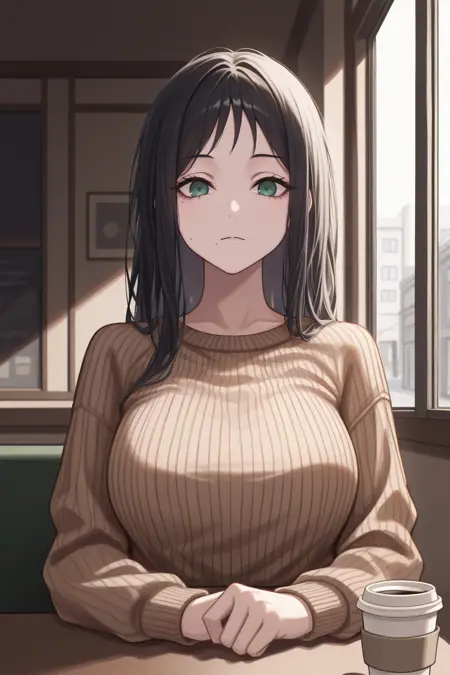기본 옷차림: 리브 스웨터, 갈색 스웨터, 검은 치마, 긴 치마