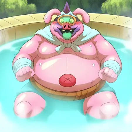 Sproink, pig, snout, pink body, goggles, belly button, purple lips, green tongue