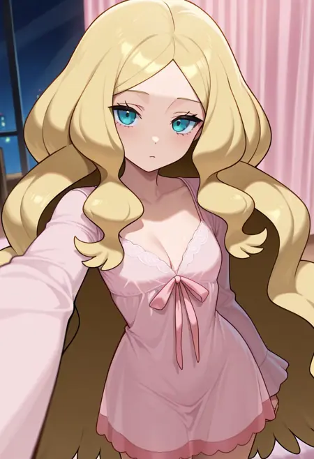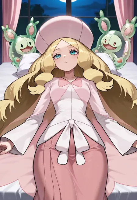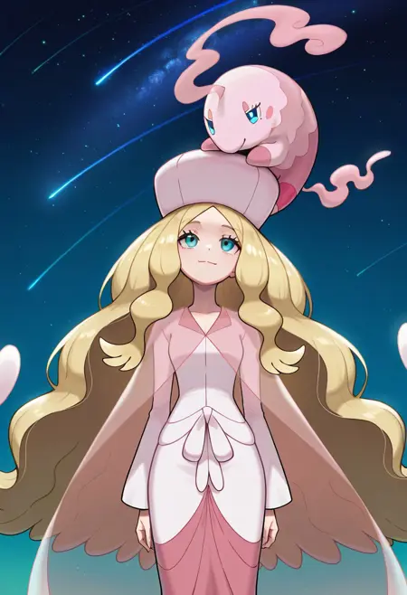 Trigger words: CaitlinPokemon, blonde, blue eyes, very long hair, light pink hat, light pink dress, pink skirt, hair ornaments, see-through cape, pink footwear,