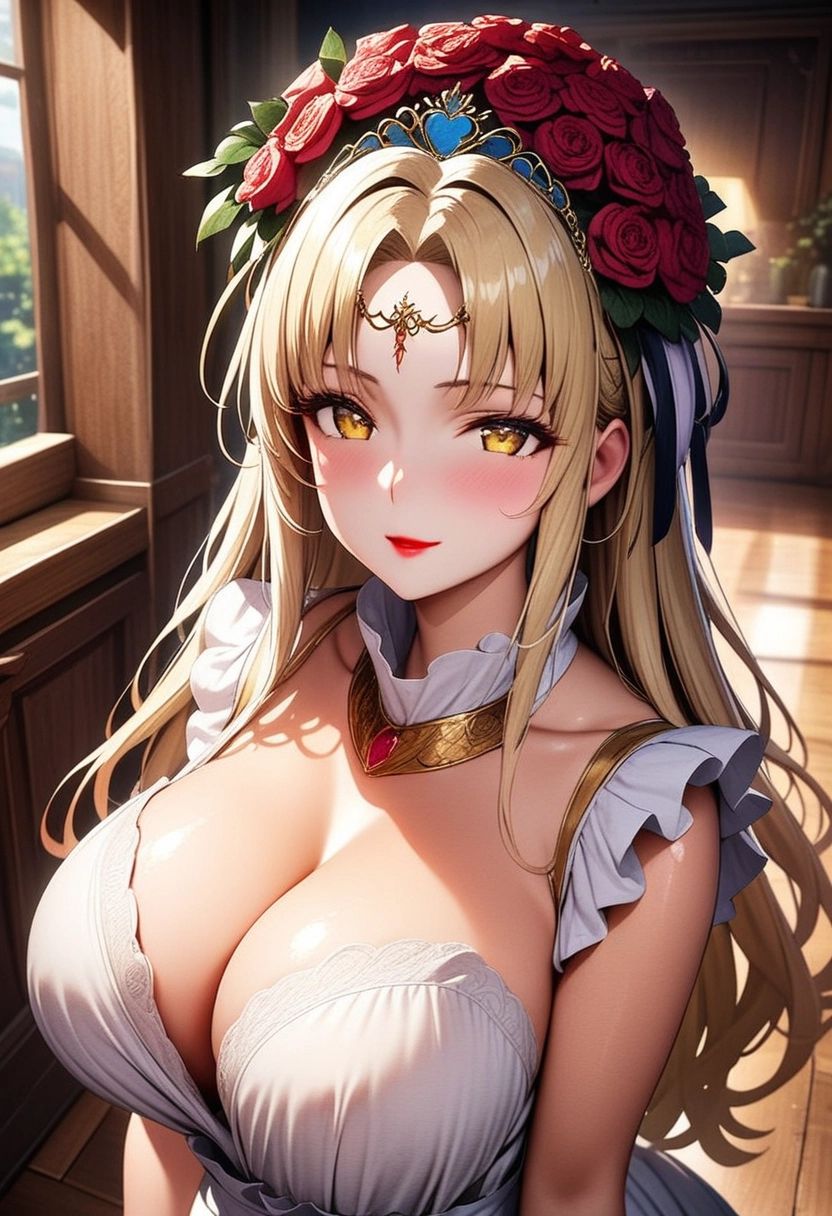 트리거 단어: aphrodite_a_xl, 금발, 노란 눈, 장미 티아라, 원형 머리장식, 머리에 꽃, 흰색 아프로디테 드레스,