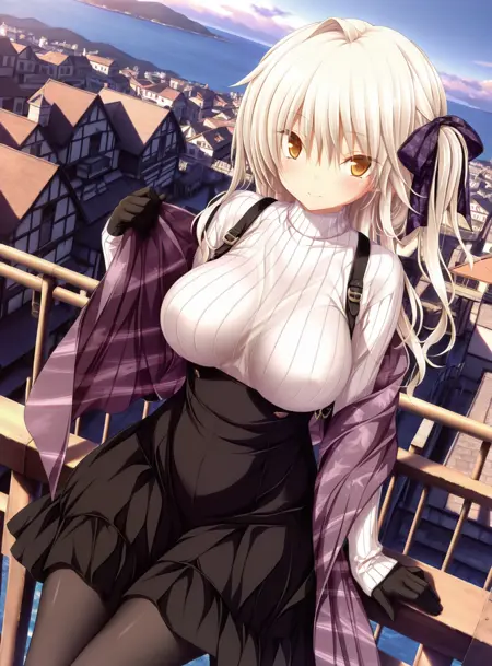 "ribbed sweater, high-waist suspender skirt, purple shawl, black gloves,"