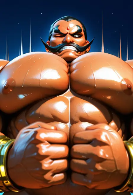 Reinforcement Prompts: "dark skin, forehead jewel, white sclera, no pupils, muscular, masculine, bara, large pectorals"
