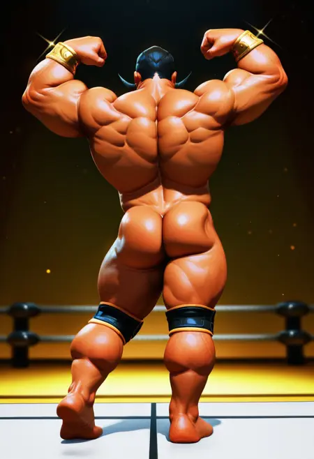 Outfit Prompts: "topless, sash, black speedo, belt, sarong, black boots, black knee pads"
