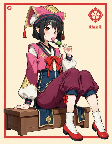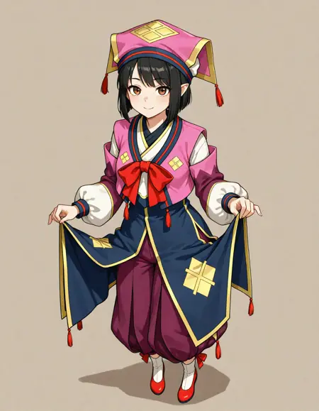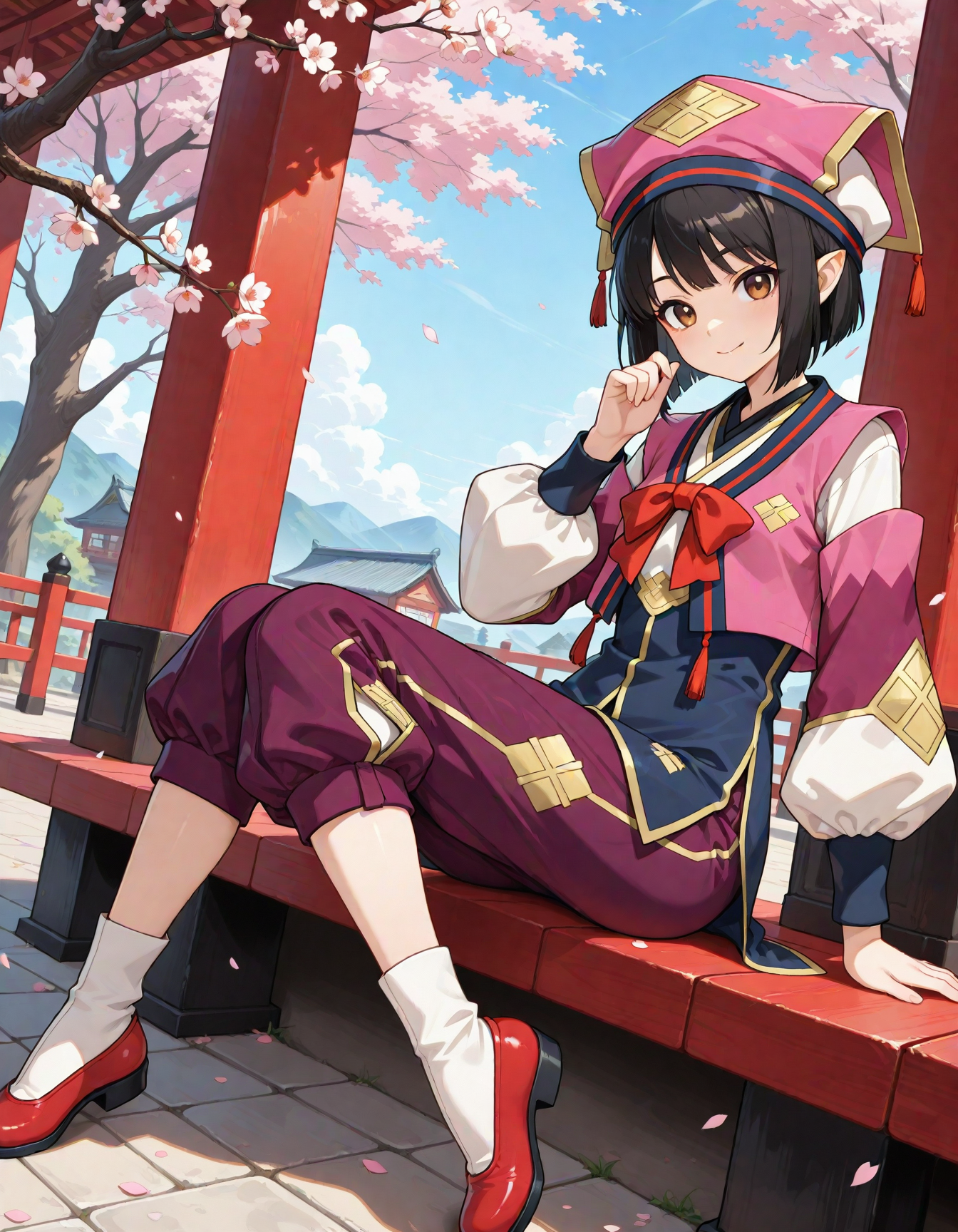 yukumokonaha, brown eyes, black hair, short hair, pointy ears, konahaclothes, pink headwear, pants, purple pants, puffy pants, red bowtie, puffy sleeves, white socks, red shoes, red footwear, tassel,