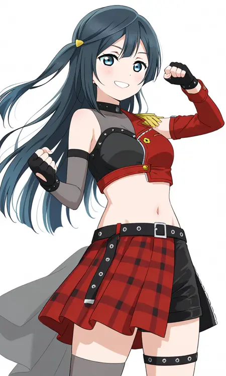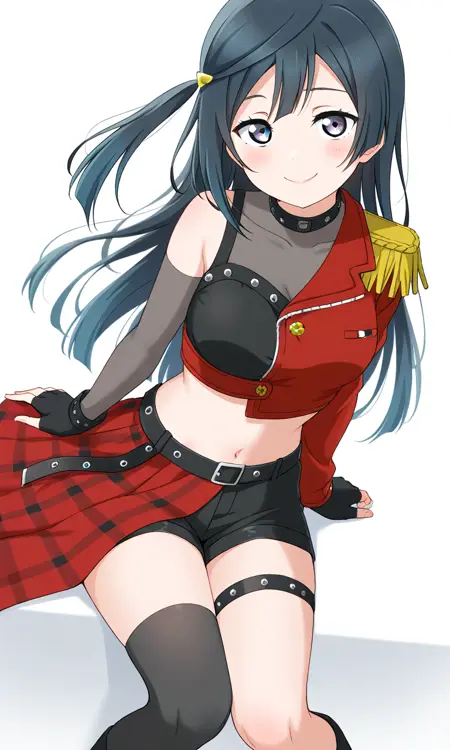 - yuuki setsuna \(love live\), dive! \(love live\), 검은 머리, 긴 머리, 회색 눈, 손가락 없는 장갑, 반스커트, 빨간 재킷, 크롭탑, 빨간 소매, 검은 허벅지 양말, 배꼽, 투명한 옷, 어깨장식, 허벅지 스트랩, 한쪽 어깨 노출, 복부 노출, 검은 숏팬츠, 공식 대체 복장