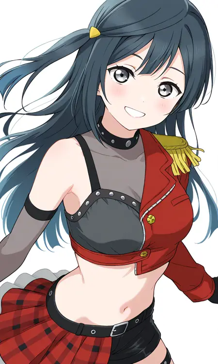• yuuki setsuna \(love live\),dive! \(love live\),黑发,长发,灰眼睛,无指手套,半裙,红色夹克,短上衣,红色袖子,黑色过膝袜,肚脐,透视衣物,肩章,大腿绑带,单肩露肤,腹部,黑色短裤,官方替代服装