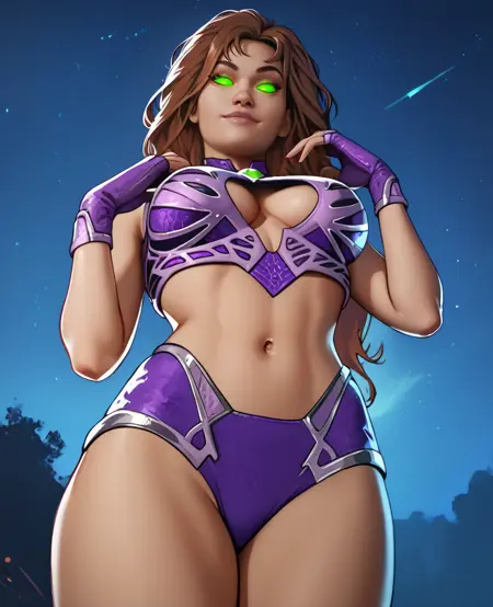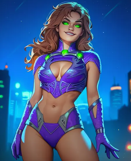 Starfire, green eyes, glowing eyes, - long brown hair, or orange hair,