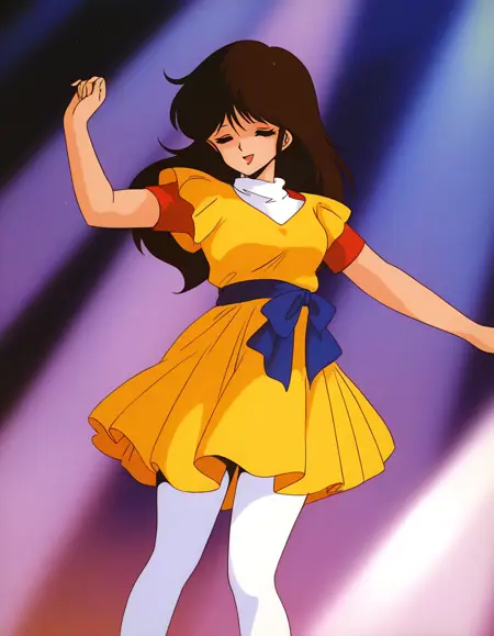 yellow dress, short sleeves, yellow skirt, pleated skirt, undershirt, red sleeve, blue sash, white pantyhose,