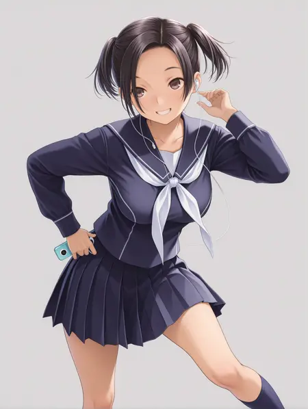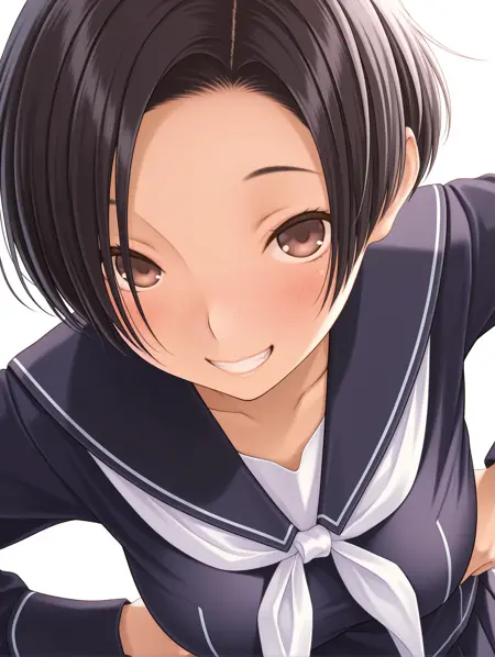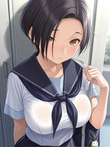 衣装ワード(夏服) ・r_s_clothes,white shirt,short_sleeves,blue neckerchief,pleated skirt,sneakers,