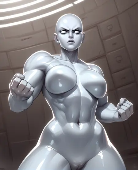 dural, bald, white eyes, or no pupils, - chrome body, or shiny skin, or silver skin, or metal skin,