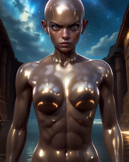 dural, bald, white eyes, or no pupils, - chrome body, or shiny skin, or silver skin, or metal skin,