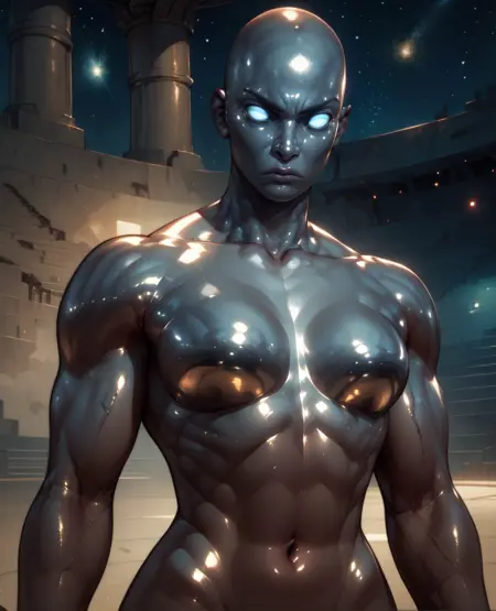 dural、秃头、白色眼睛、无瞳孔、铬金属身体、闪亮皮肤、银色皮肤、金属皮肤