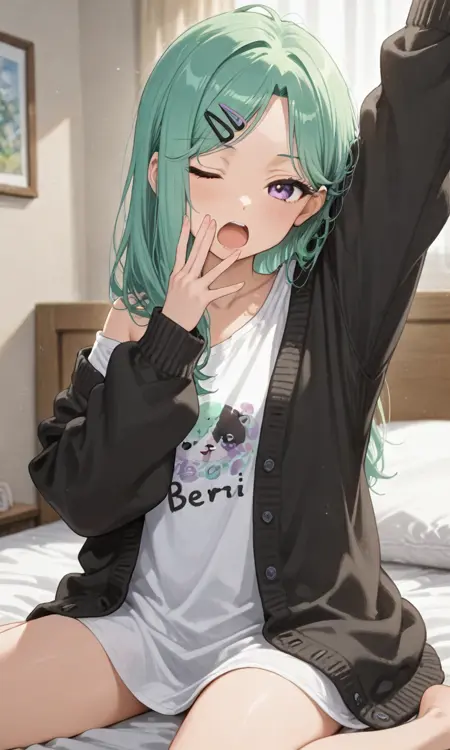 beni cozy cmsl, short hair, single hair bun, camisole, purple shorts, black cardigan, off shoulder🛏️다섯 번째 옷 (룸웨어-셔츠):