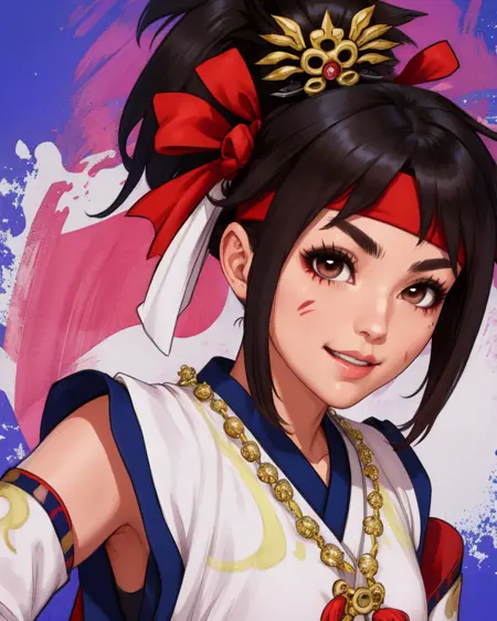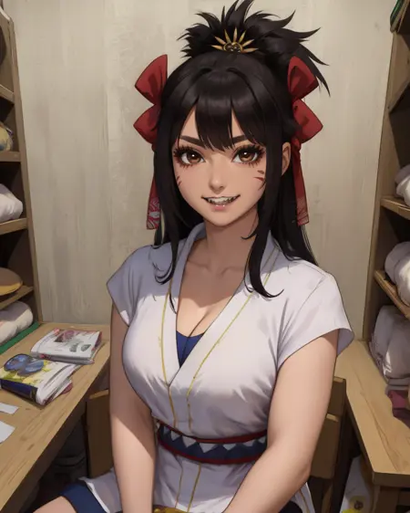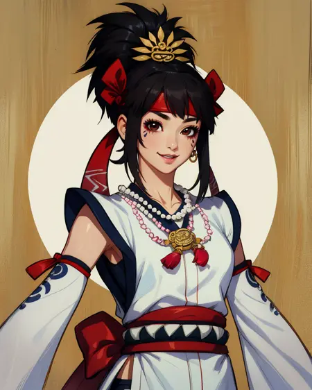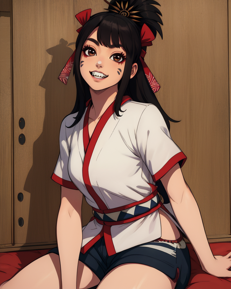 himiko、短い黒髪、茶色の目、ポニーテール、顔の模様、