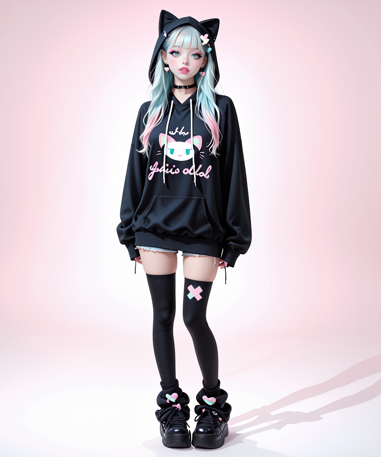 Secondary tags : Top, skirt, shorts, gloves, leg warmers, oversized hoodie with ears, bandaids, face bandaids, backpack, shoes, jacket, pastel colors, thighhighs, fishnets, face stickers, kawaii make_up
