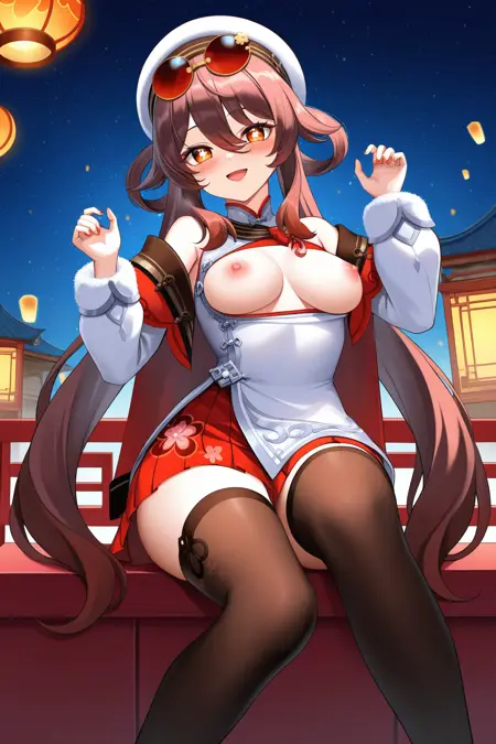 Hu Tao \(チェリーズ・スノーローデン\) \(原神\)、1girl、Boo Tao \(原神\)、リング、茶色の髪、帽子、シンクホーソン、花形の瞳、長い髪、幽霊、曇りガラスの眼鏡、赤い目、サングラス、ソロ、ジュエリー、複数のリング、記号形の瞳、黒いシンクホーソン、ツインテール、ネイルポリッシュ、スカート、白い頭部装飾、