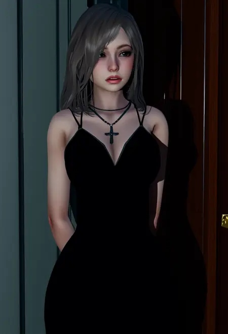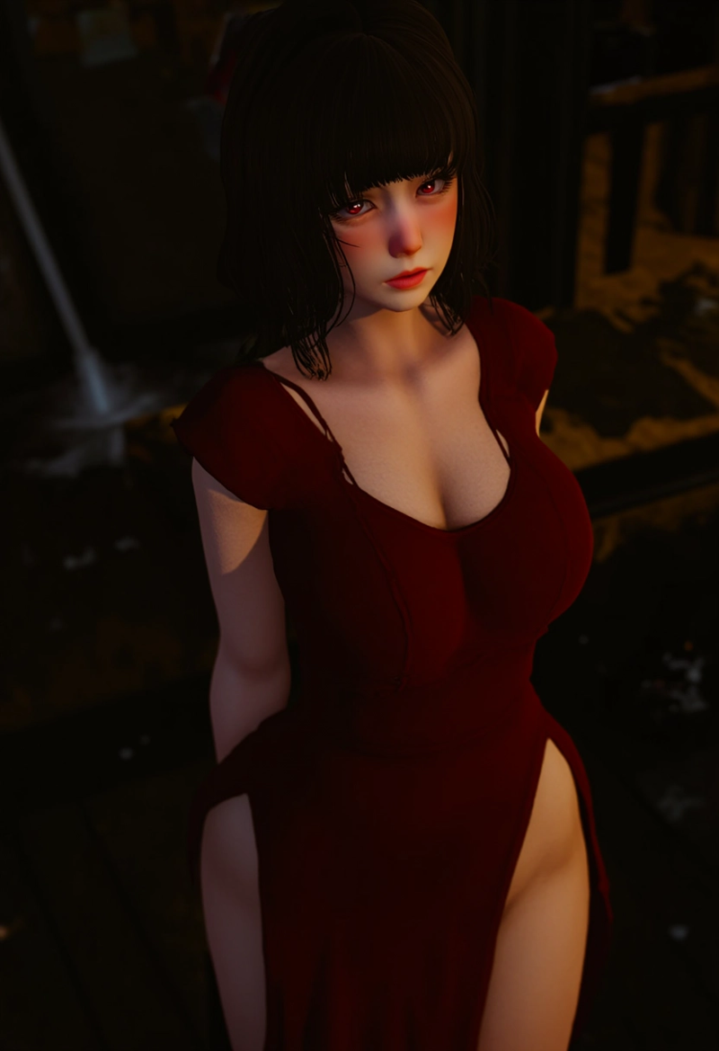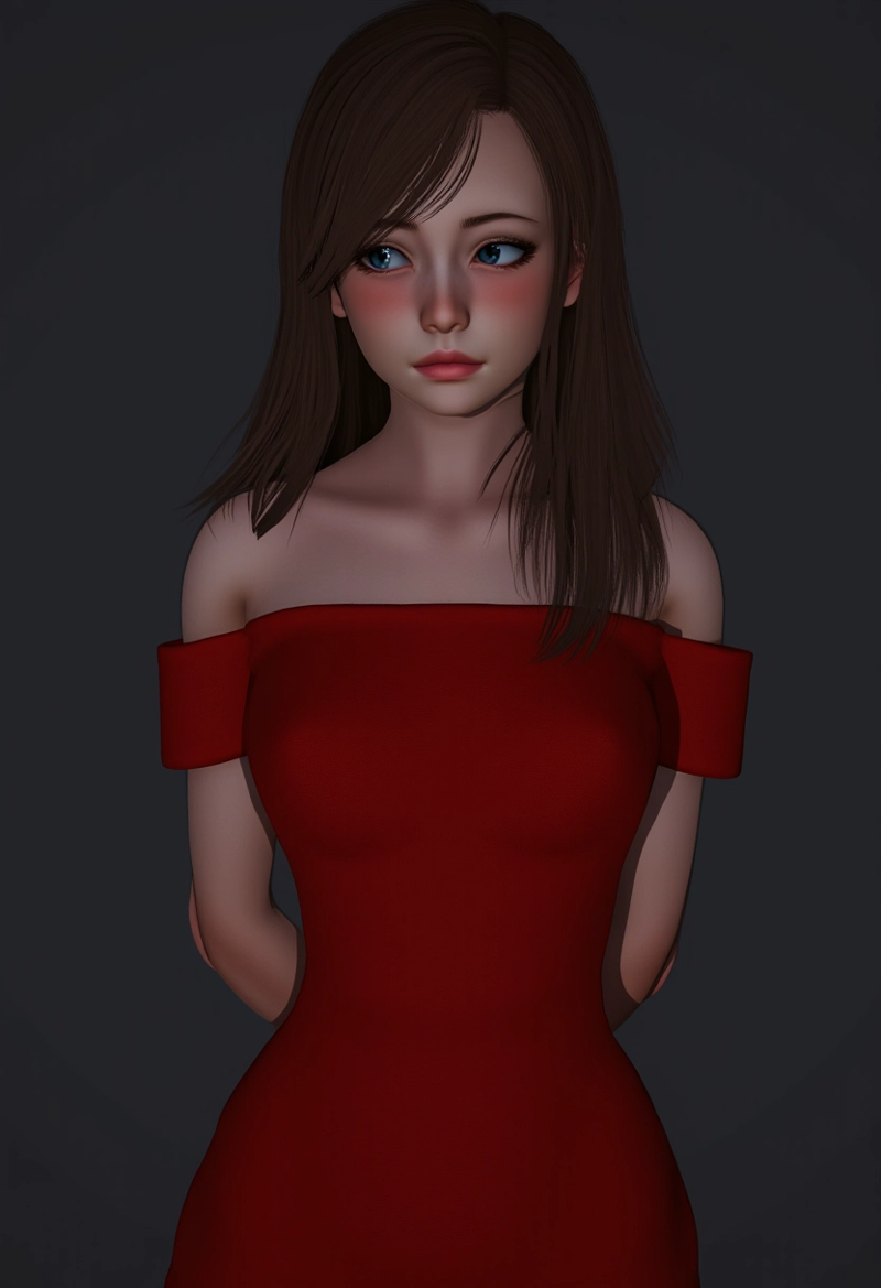 프롬프트: 8K 해상도의 걸작, 초현실적인 3D 렌더링, Annie(Eternum), Annie Winters (Eternum), 1girl, solo, 갈색 머리, 파란 눈, 긴 머리, 얼굴 붉힘, 드레스, 어깨 노출, 팔을 뒤로, 입술, 빨간 드레스, 리얼리스틱, Eternum