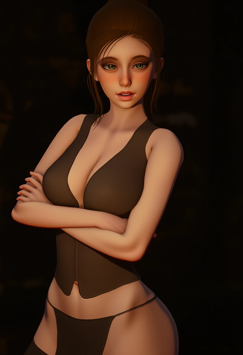 프롬프트: 검열되지 않음, 8K 해상도의 걸작, 초현실적인 3D 렌더링, Dalia Carter (Eternum), 1girl, 가슴, 갈색 머리, 배꼽, 젖꼭지, 단발머리, 젖꼭지 노출, 팔을 교차, 입술, 큰 가슴, Eternum