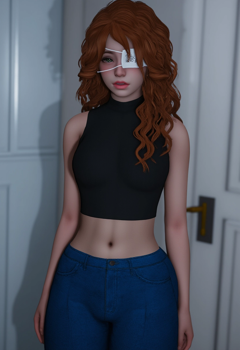 프롬프트: 8K 해상도의 걸작, 초현실적인 3D 렌더링, Nova(Eternum), Nova Johnson (Eternum), 1girl, solo, 안대, 긴 머리, 복부, 배꼽, 문, 리얼리스틱, 청바지, 갈색 머리, 갈색 눈, 곱슬머리, 청바지, 바지, 흡입형, Eternum
