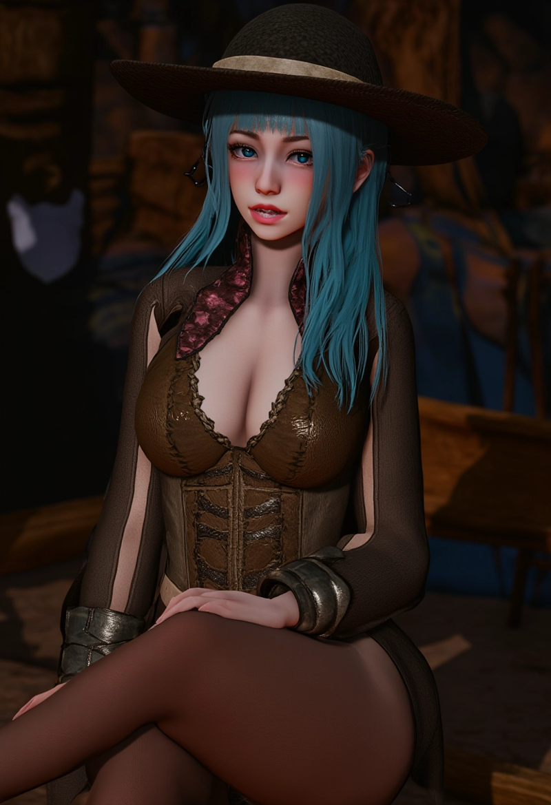 프롬프트: 8K 해상도의 걸작, 초현실적인 3D 렌더링, Calypso(Eternum), Calypso (Eternum), 1girl, solo, 모자, 긴 머리, 파란 머리, 가슴, 팬티스타킹, 젖꼭지 노출, 파란 눈, 앉아 있는 자세, 큰 가슴, 코르셋, 다리 교차, 아쿠아 헤어, Eternum