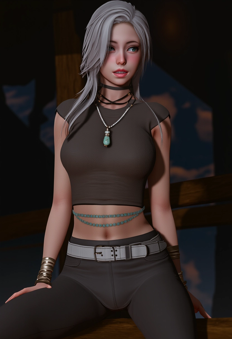 프롬프트: 8K 해상도의 걸작, 초현실적인 3D 렌더링, Alex(Eternum), Alex Bardot (Eternum), 1girl, solo, 보석, 파란 눈, 목걸이, 벨트, 긴 머리카락, 초커, 복부, 배꼽, 바지, 흰 머리, 입술, 앉아 있는 자세, Eternum