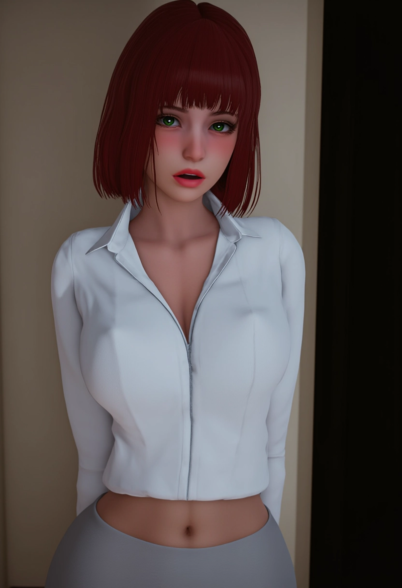 프롬프트: 8K 해상도의 걸작, 초현실적인 3D 렌더링, Nancy(Eternum), Nancy Carter (Eternum), 1girl, solo, 녹색 눈, 배꼽, 복부, 빨간 머리, 셔츠, 단발머리, 시선을 직접 바라봄, 갈색 머리, 벌어진 입, 바지, 벽에 기대어 있음, 입술, 가슴, 리얼리스틱, 흰 셔츠, Eternum