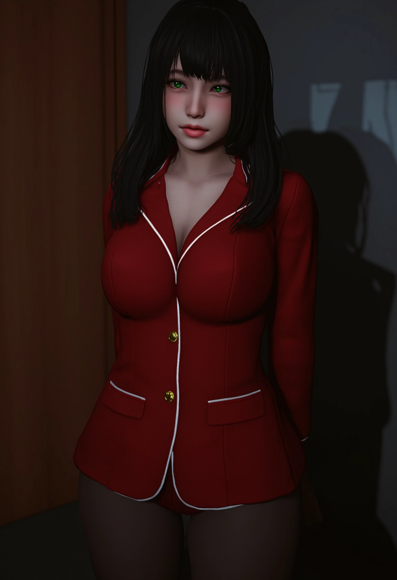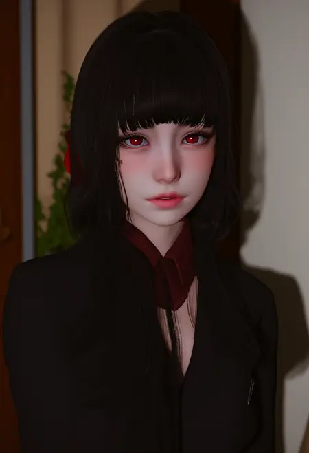 프롬프트: 8K 해상도의 걸작, 초현실적인 3D 렌더링, Luna(Eternum), Luna Hernandez (Eternum), 1girl, solo, 검은 머리, 앞머리, 긴 머리, 빨간 넥타이, 빨간 눈, 학교 근무복, Eternum